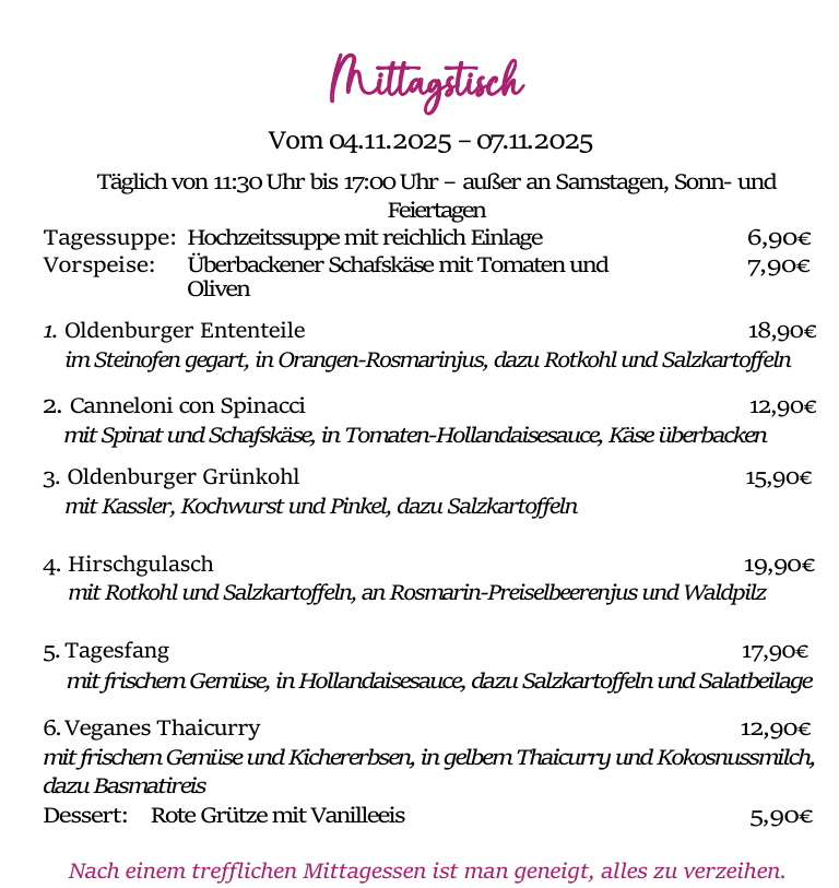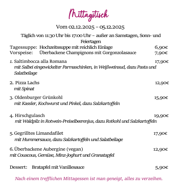 genießen Sie unseren Mittagstisch von 11:30 bis 17:00 Uhr jeden Dienstag bis Freitag. (Außer an Samstagen, Sonn- und Feiertagen)
