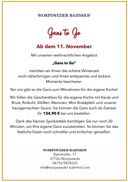 Es ist bald wieder so weit! Die Weihnachtszeit kommt näher und näher. Aus diesem Grund bietet das Restaurant Worpsweder Bahnhof die Gans To Go an, sodass Sie ein festliches Weihnachtsessen zu sich nach Hause holen können.