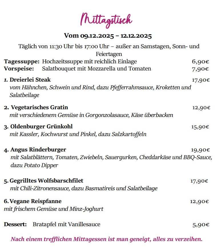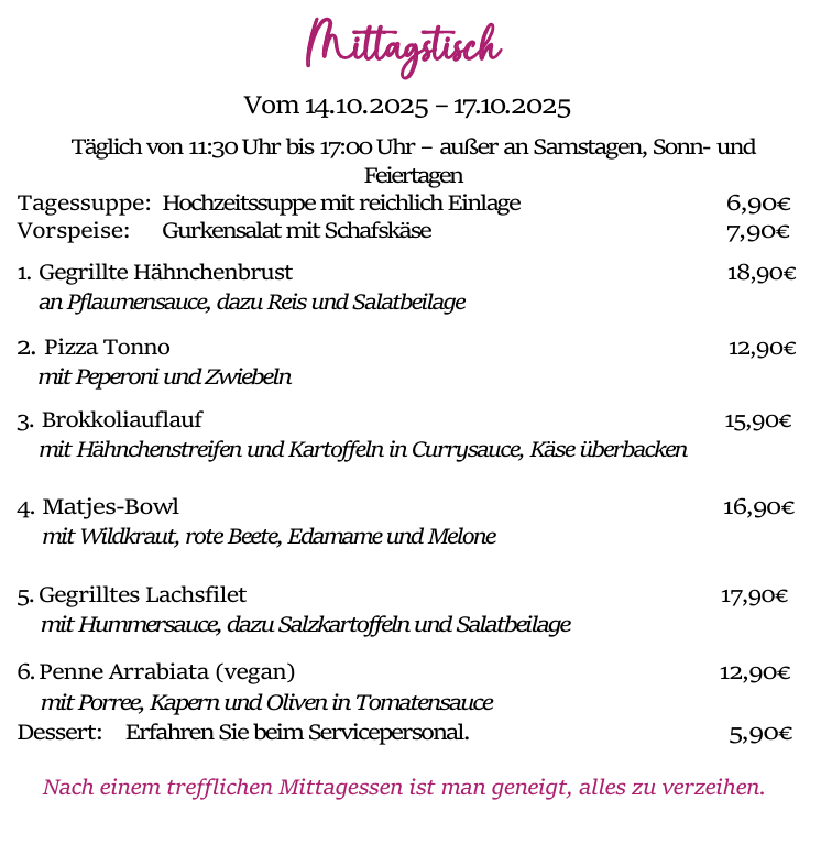 genießen Sie unseren Mittagstisch von 11:30 bis 17:00 Uhr jeden Dienstag bis Freitag. (Außer an Samstagen, Sonn- und Feiertagen)